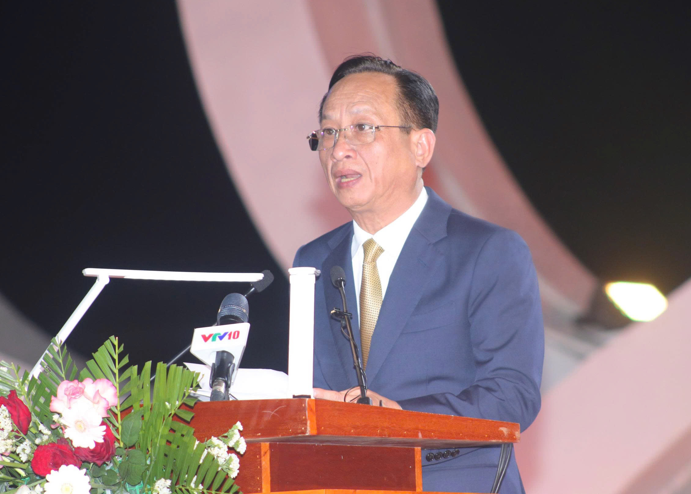 Ông Nguyễn Quốc Thanh - Giám đốc Sở Văn hóa, Thể thao và Du lịch tỉnh Cà Mau phát biểu, thông tin về biểu tượng 3 hạt lúa.