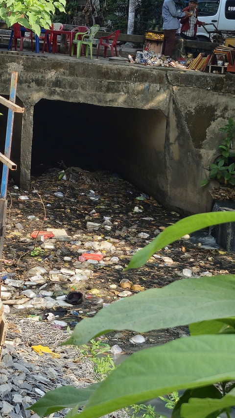 Dưới chân cầu Cống Lở rác ứ đọng làm tắc nghẽn dòng chảy