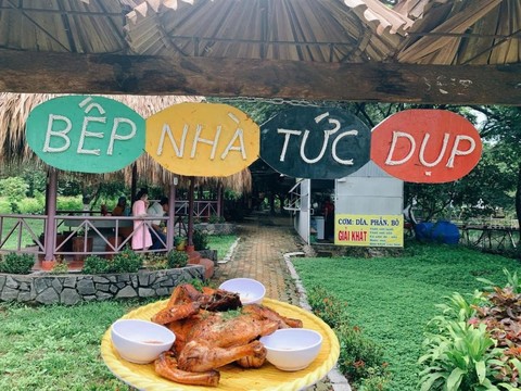 Giữa hành trình khám phá ấy, ẩm thực chính là “nốt trầm quyến rũ” níu chân du khách. Đặc biệt, món gà đốt – một đặc sản trứ danh của vùng Bảy Núi – đã trở thành “linh hồn vị giác” không thể thiếu khi đến Đồi Tức Dụp. Gà được chọn lọc kỹ lưỡng, tẩm ướp theo công thức riêng, rồi đốt nguyên con trên than hồng cho đến khi lớp da vàng ruộm, giòn rụm, tỏa hương thơm nồng nàn. Khi xé từng thớ thịt mềm ngọt, chấm cùng muối ớt xanh cay nồng, thực khách như cảm nhận trọn vẹn tinh túy của núi rừng – một hương vị mộc mạc mà sâu lắng, như chính con người miền Tây chân chất, nghĩa tình.