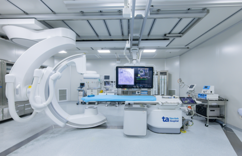 Phòng can thiệp hybrid (Hybrid Cath Lab) cao cấp, được trang bị bàn mổ chuyên dụng, hệ thống chụp mạch số hóa xóa nền hiện đại, thực hiện các ca can thiệp