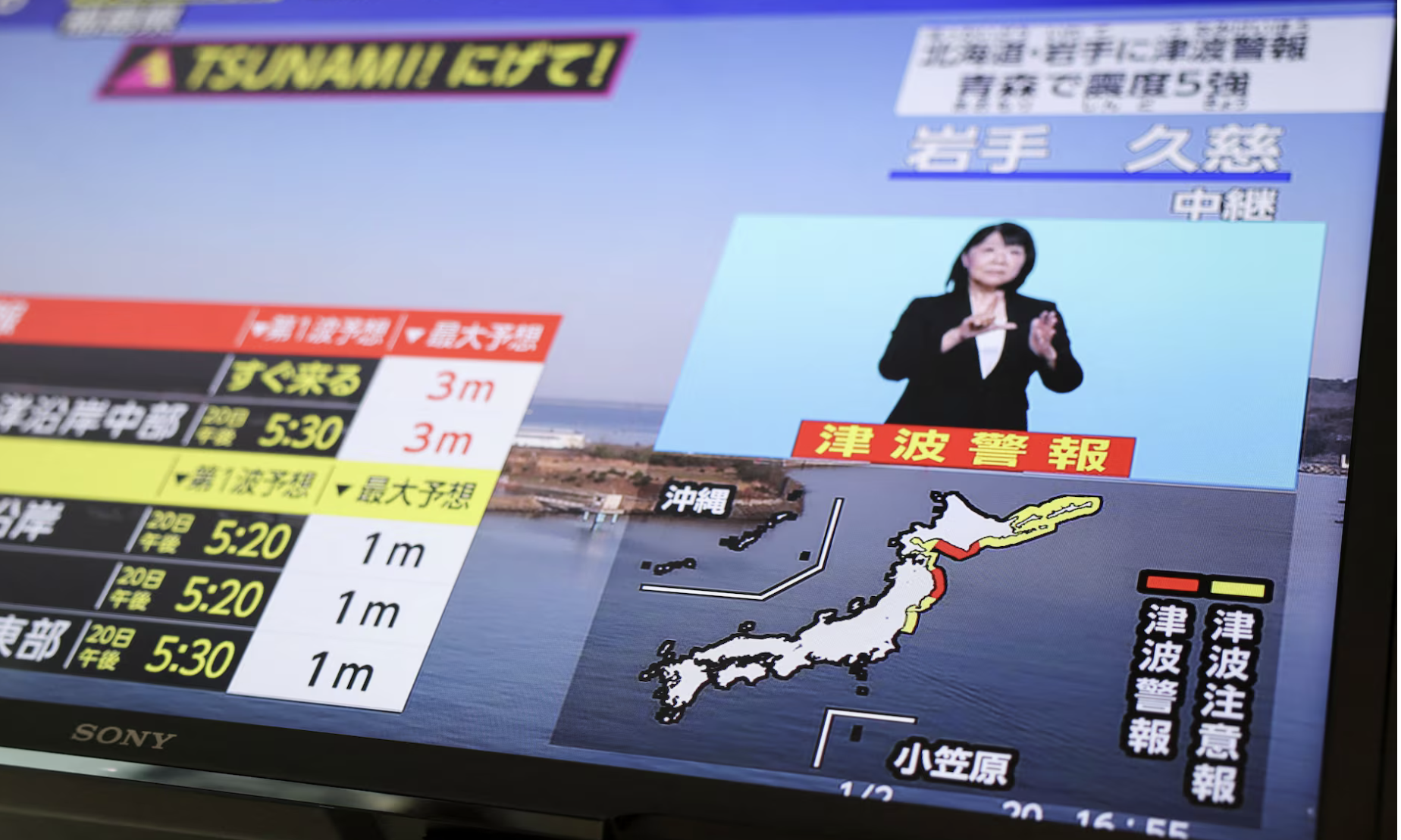 Bản tin trên đài truyền hình Nhật Bản cảnh báo sóng thần 3m có thể ập vào bờ biển sau trận động đất (vùng tô đỏ) - Ảnh: Reuters