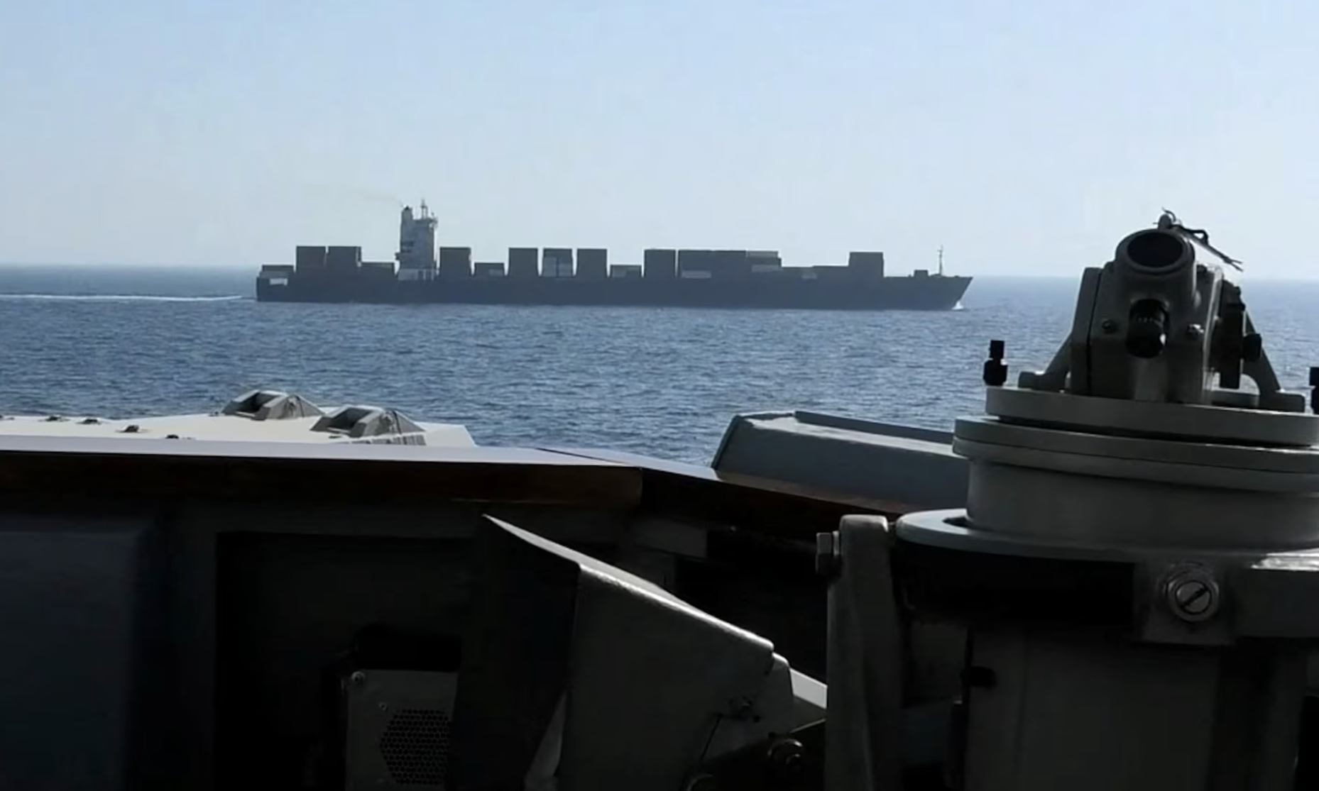 Hình ảnh tàu chở hàng M/V Touska mang cờ Iran di chuyển phía xa khi tàu khu trục mang tên lửa dẫn đường USS Spruance của Hải quân Mỹ thực hiện hành động ngăn tàu này đi qua phía bắc Biển Ả Rập vào ngày 19/4 - Ảnh: CENTCOM