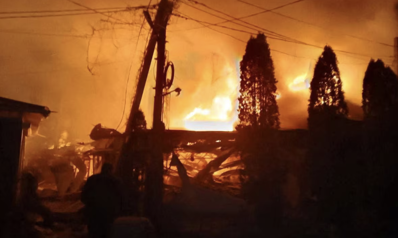 Lửa bốc lên từ khách sạn và quán cà phê ở làng Khorly, khu vực Kherson hôm 1/1. Nga cáo buộc Ukraine thực hiện vụ tấn công này bằng máy bay không người lái - Ảnh: Reuters