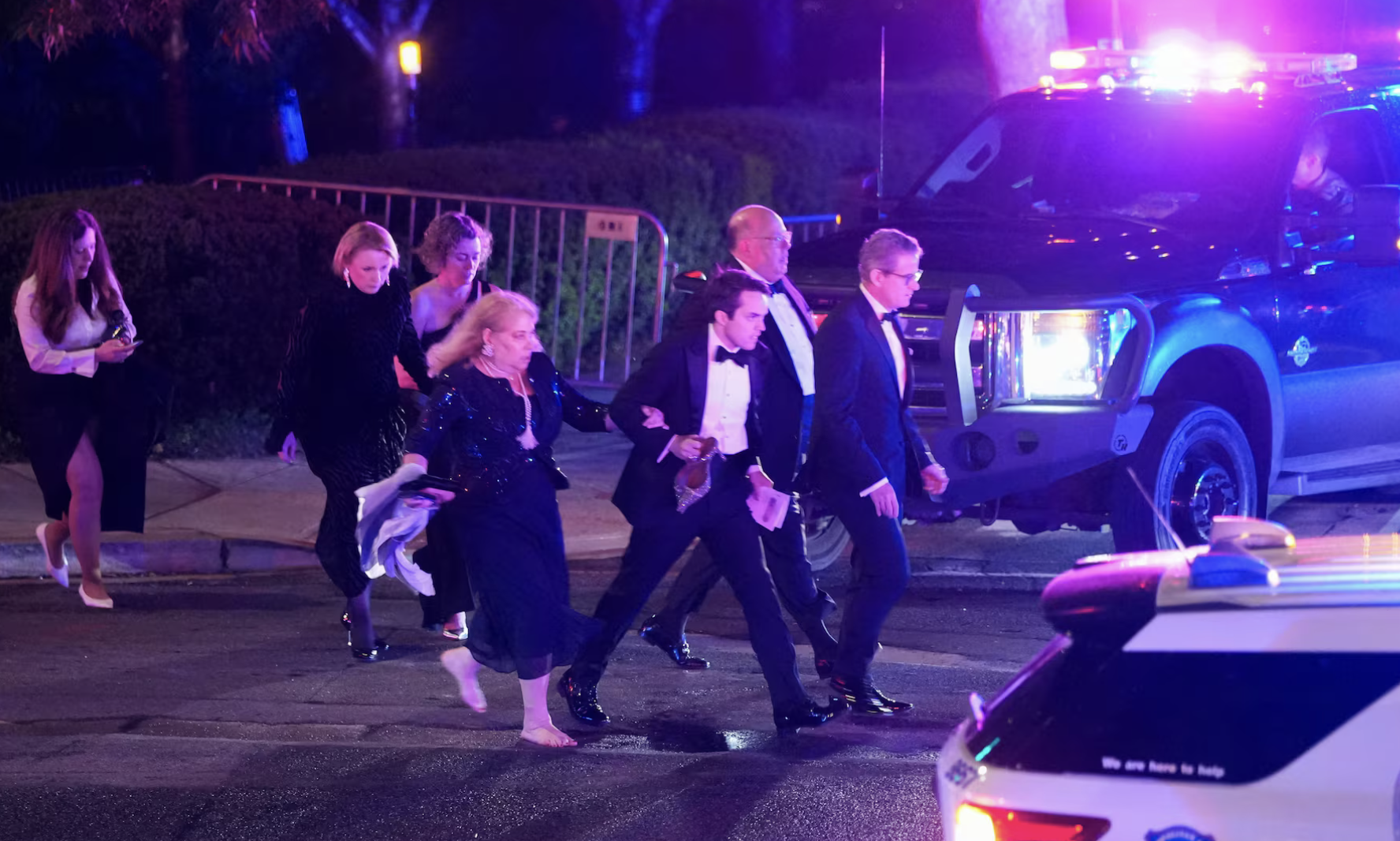 Các khách mời của buổi dạ tiệc hoảng loạn khi hay tin kẻ nổ súng tấn công khu vực an ninh dẫn vào sự kiện - Ảnh: Reuters