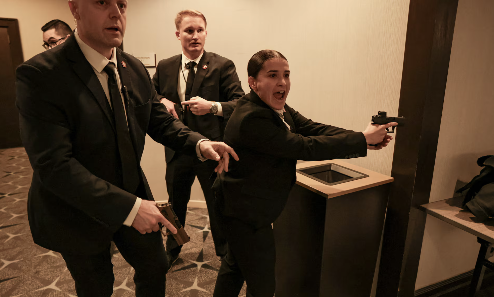 Các nhân viên an ninh khác trong quân phục chiến đấu đã xông lên sân khấu và sơ tán ông Trump và vợ. Một số nhân viên an ninh chiếm vị trí trên sân khấu, chĩa súng trường vào phòng khiêu vũ. Các thành viên nội các sau đó được sơ tán khỏi địa điểm từng người một.