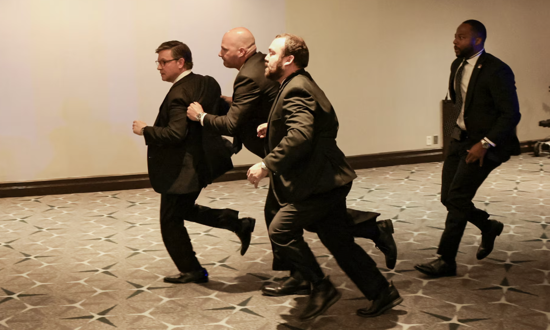 Lực lượng mật vụ sơ tán Chủ tịch Hạ viện Mike Johnson (đeo kính) - Ảnh: Reuters
