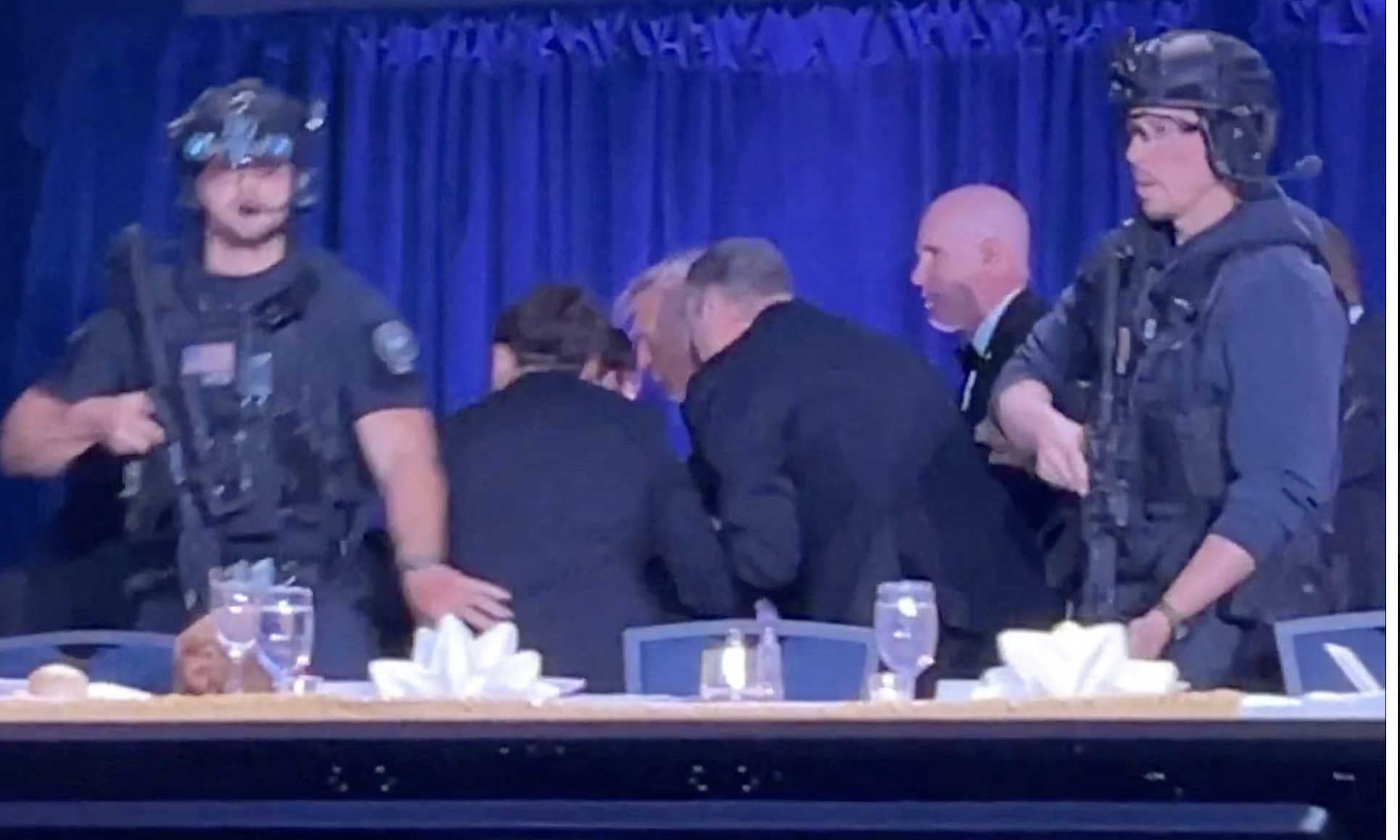 Tổng thống Trump được hộ tống ra khỏi bữa tiệc tối sau vụ nổ súng - Ảnh: Reuters