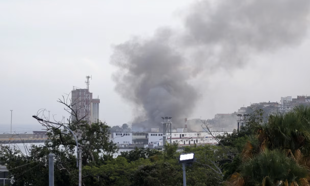 Khói bốc lên ở cảng La Guaira, Venezuela sau hàng loạt vụ nổ nghi do Mỹ tập kích ở thủ đô Caracas ngày 3/1 - Ảnh: Getty