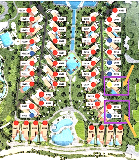 Ngày 20/5/2016, Công ty Hồ Tràm được cấp GCN quyền sử dụng 160.673,2m2 đất (đo đạc thực tế ngày 10/12/2018 là 154.302m2). Ngày 03/01/2020, Công ty được cấp phép xây dựng, trong đó có 3 biệt thự mã số "BV15" với diện tích đất 346,5m2; "BV16" với 310,2m2 và "GV28" với 486,4m2.