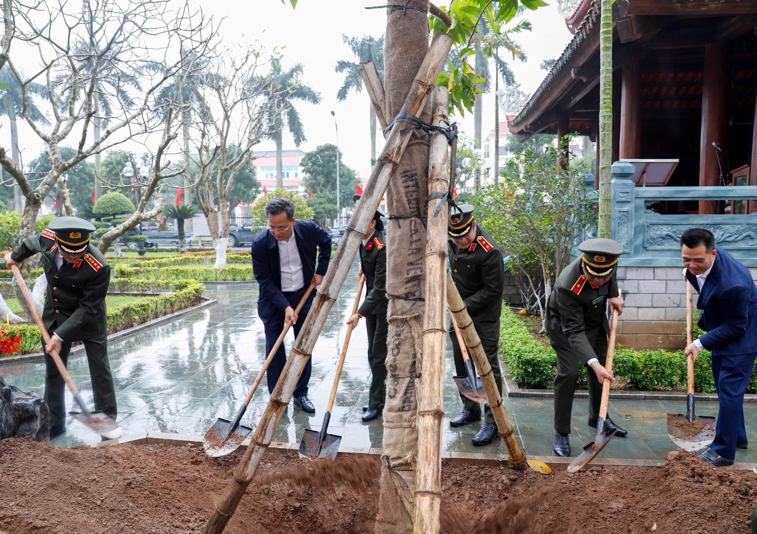 Bộ trưởng Lương Tam Quang cùng các đại biểu trồng cây lưu niệm tại khuôn viên Công an tỉnh Hưng Yên
