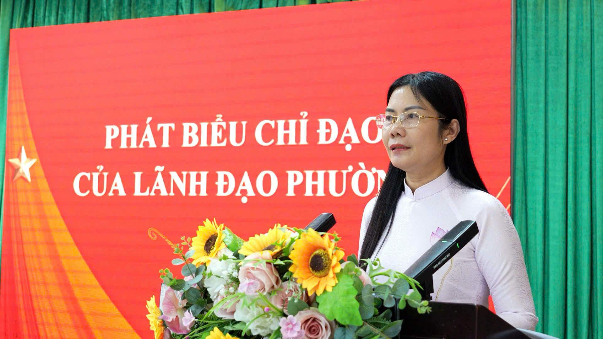 Đồng chí Lê Thị Ngọc Hiền, Chủ tịch UBND phường Hòa Hưng phát biểu tại hội nghị