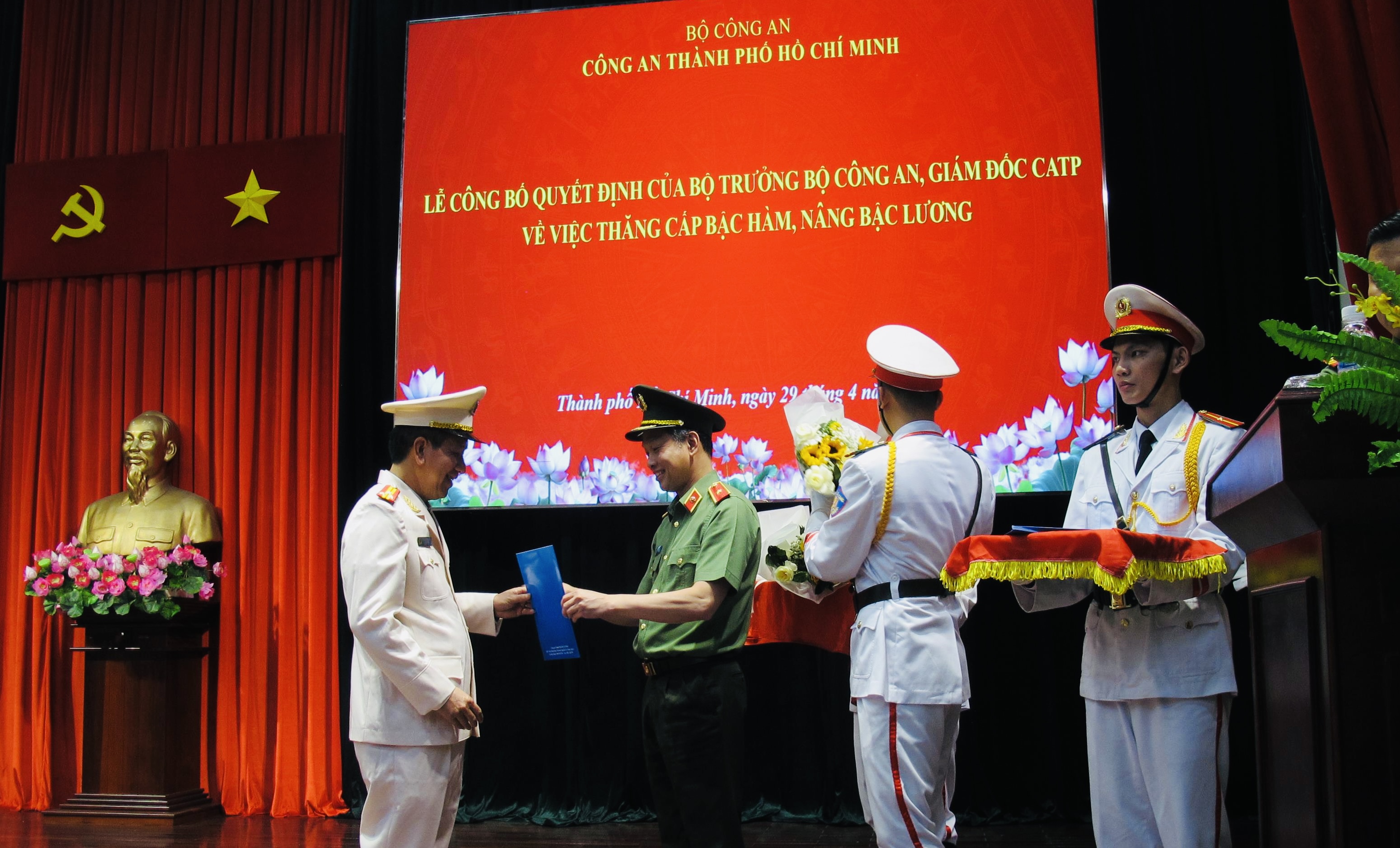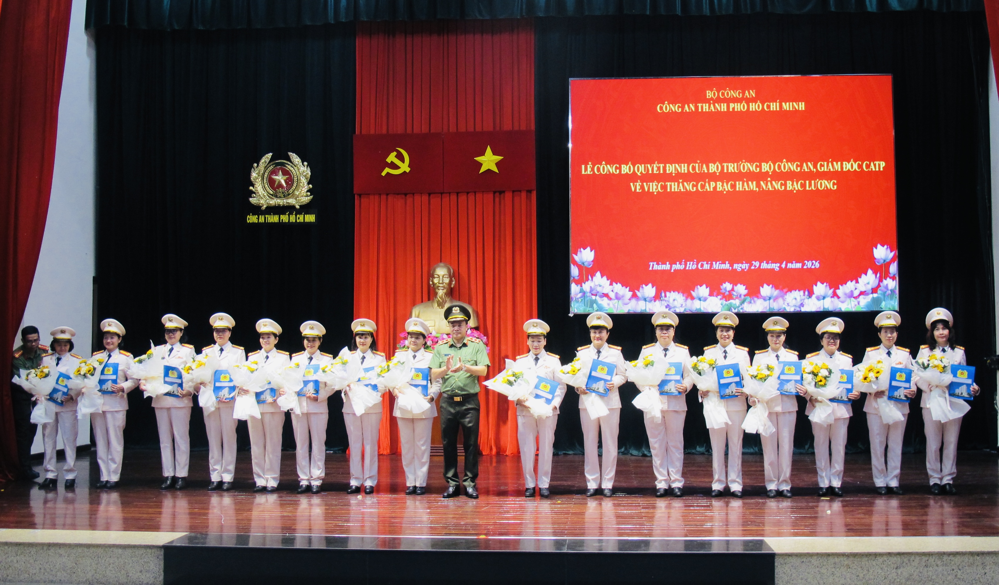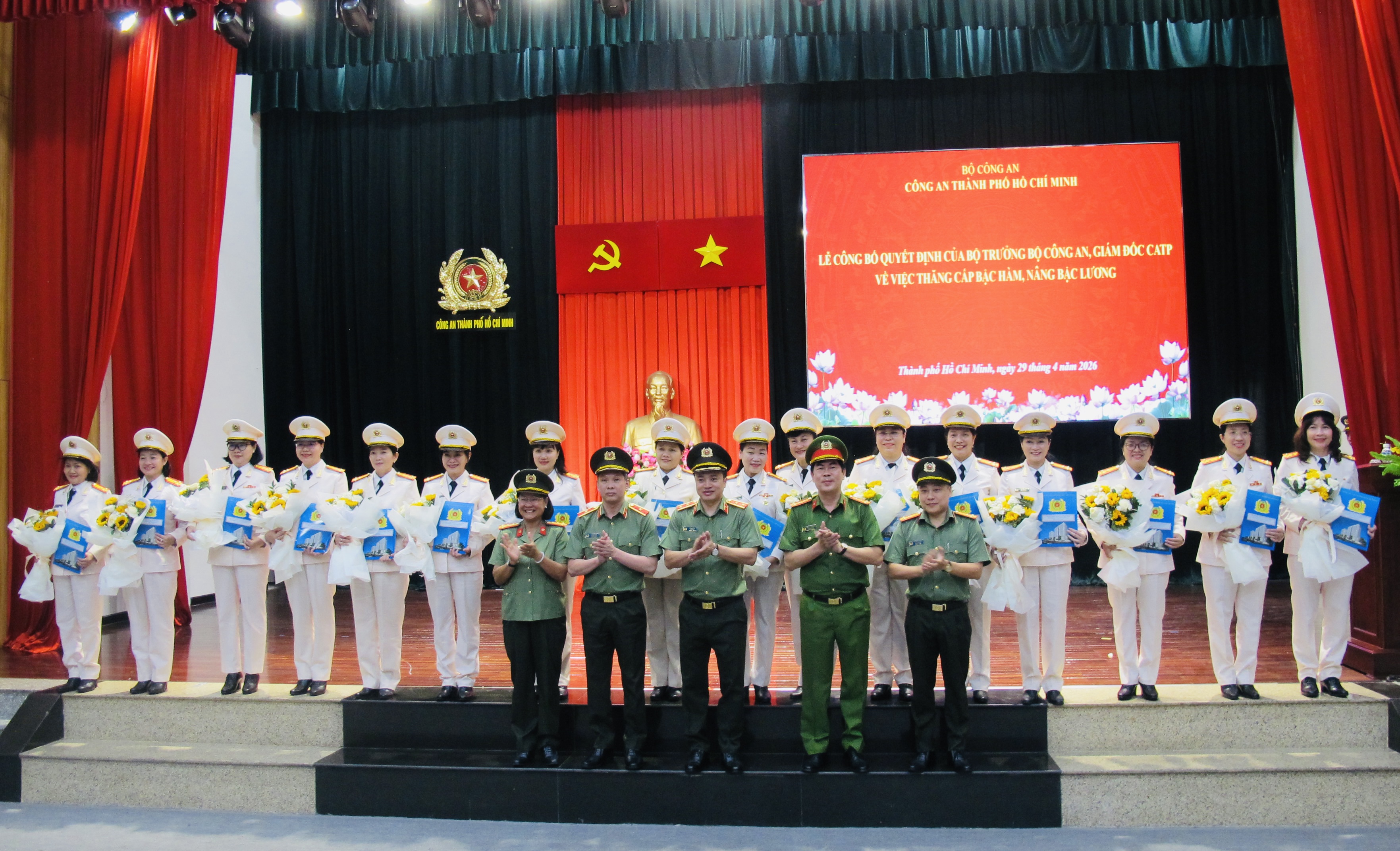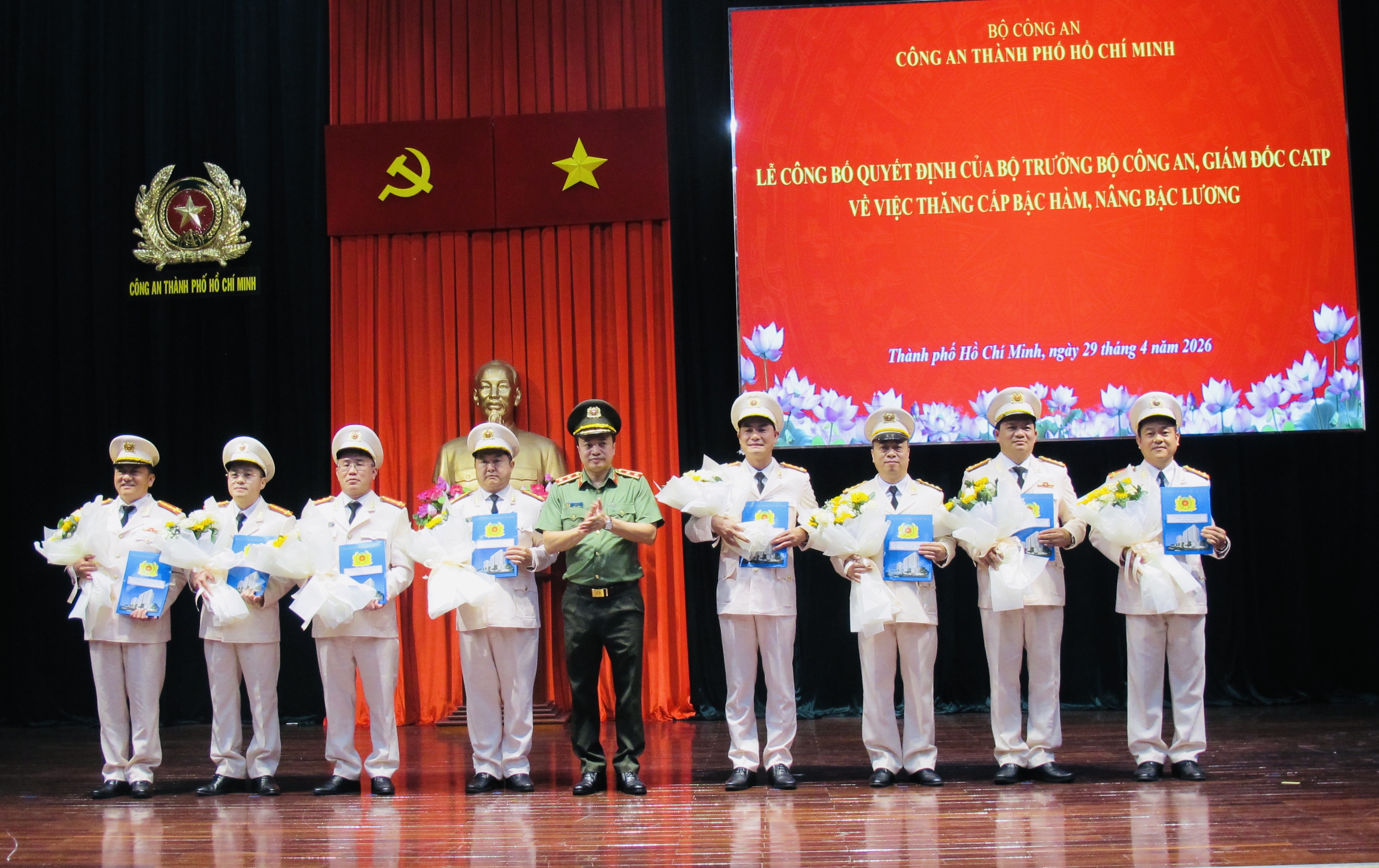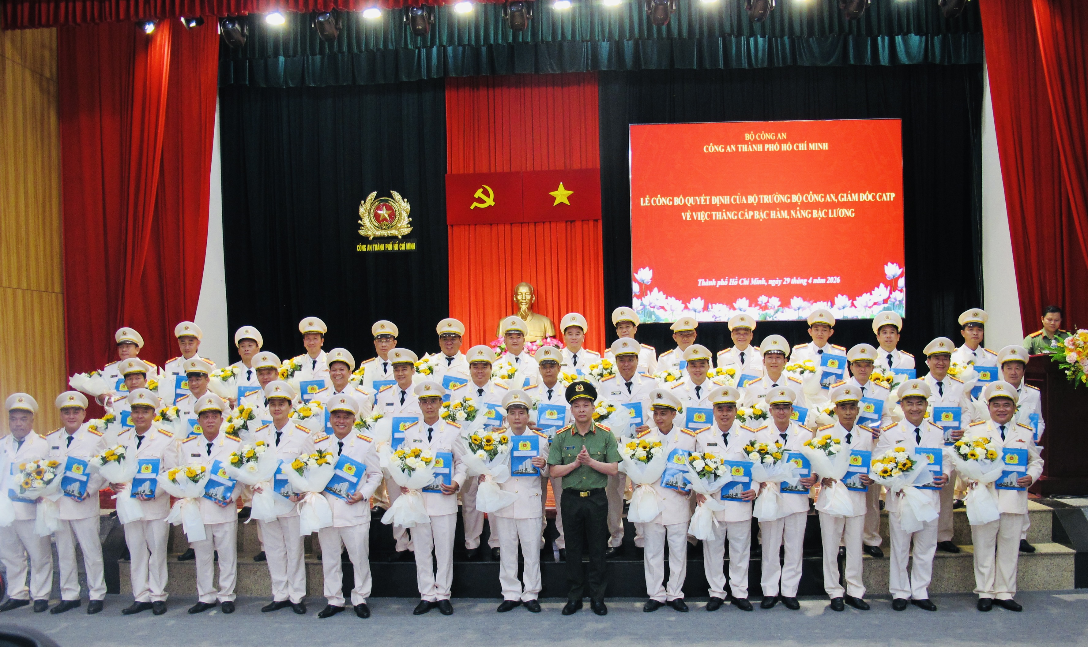 Chiều 29/4/2026, Công an TPHCM tổ chức Lễ công bố Quyết định của Bộ trưởng Bộ Công an, Giám đốc CATP về việc thăng cấp bậc hàm, nâng lương cho 185 sĩ quan thuộc lực lượng CATP. Trung tướng Mai Hoàng- Uỷ viên Ban Thường vụ Thành ủy, Bí thư Đảng ủy, Giám đốc CATP chủ trì hội nghị. Được lãnh đạo Bộ Công an và Giám đốc CATP thăng cấp bậc hàm, nâng lương đợt này có 185 sĩ quan lãnh đạo, chỉ huy trong lực lượng CATP, trong đó có 8 đồng chí được thăng cấp bậc hàm, nâng lương từ Thượng tá lên Đại tá.