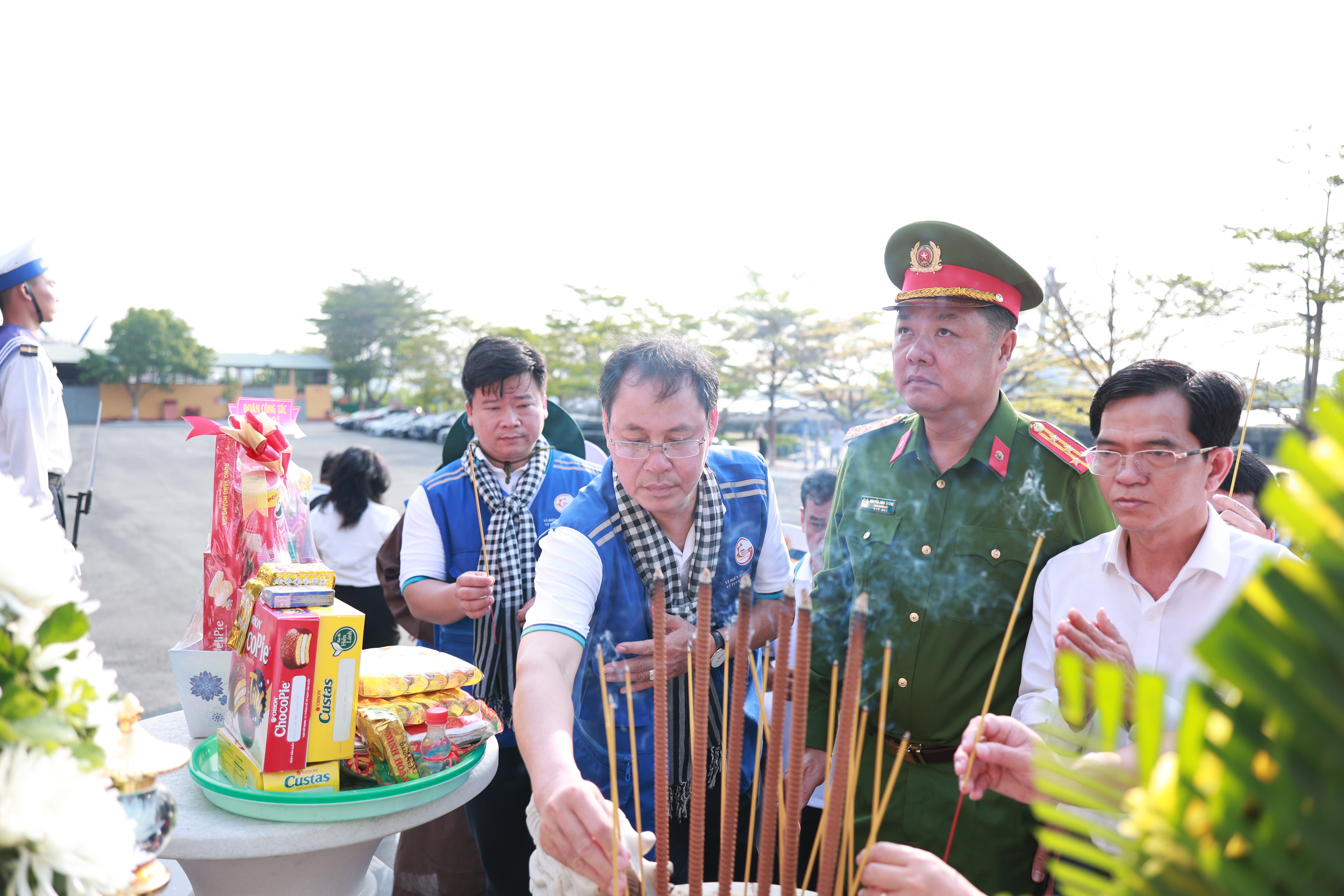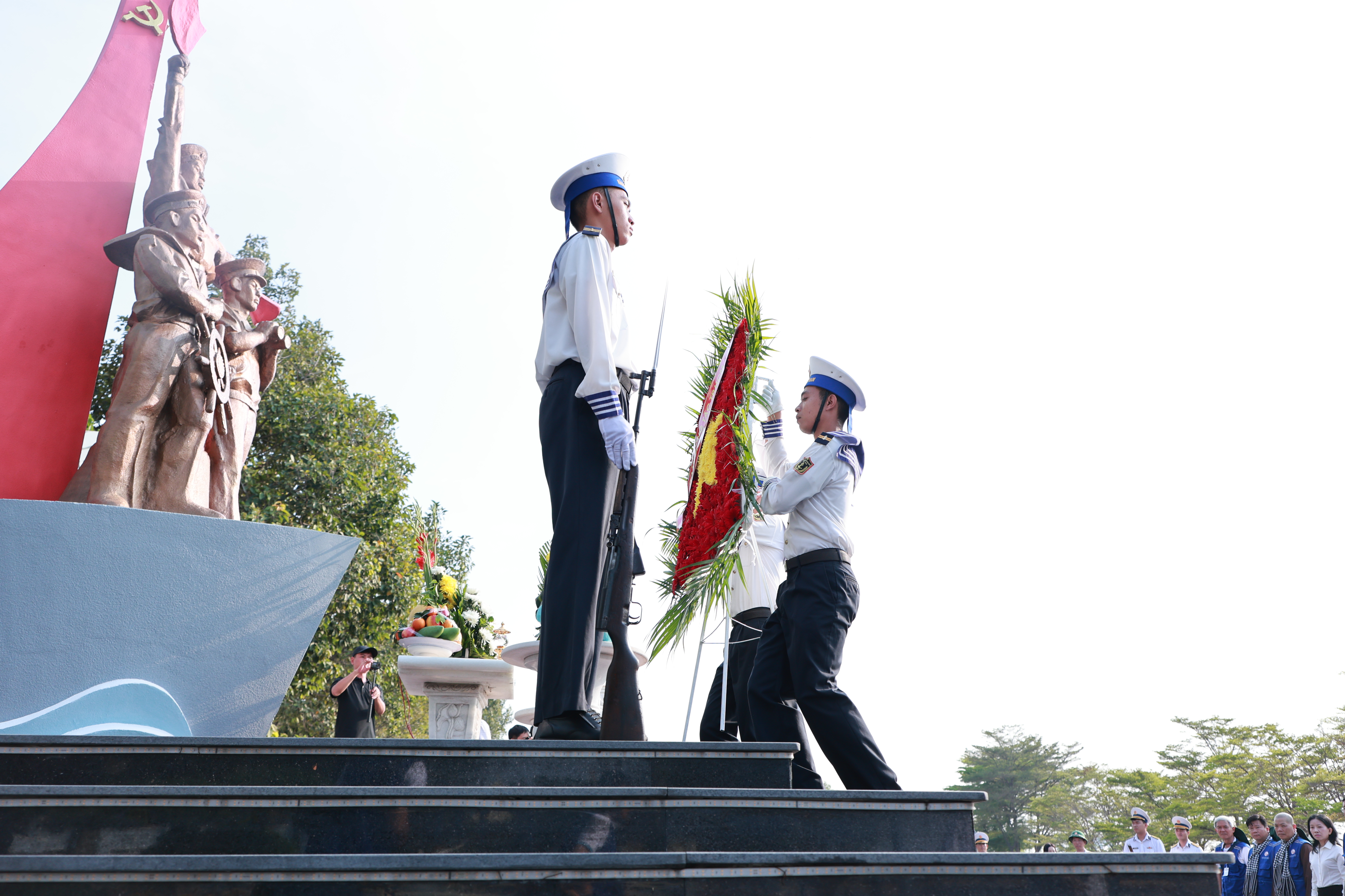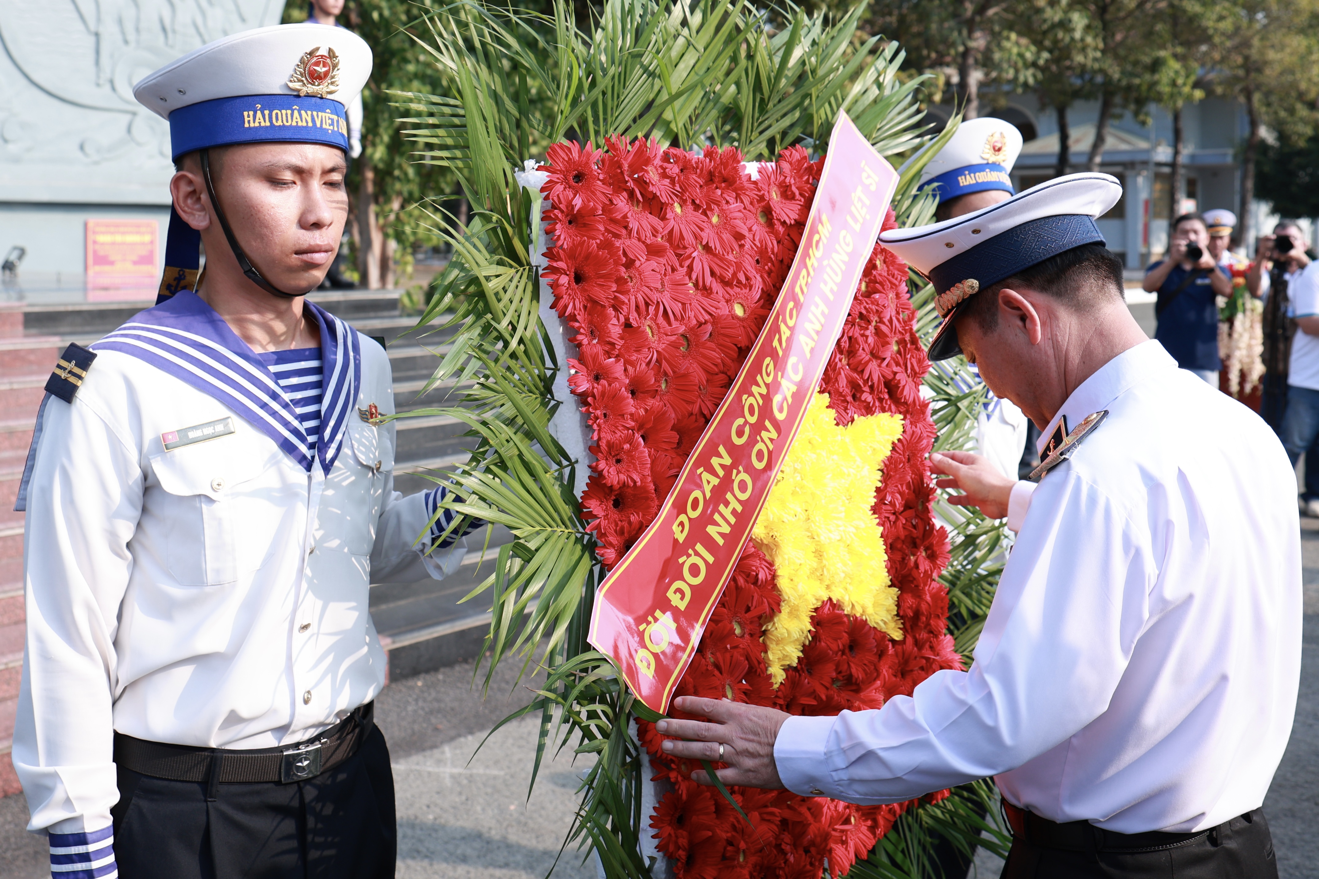 Các đồng chí lãnh đạo TPHCM và đại biểu tham gia đoàn công tác số 12 và tổ chức tiễn đoàn lên đường thăm Trường Sa và Nhà giàn DK1, làm lễ dâng hương, hoa tại Đài tưởng niệm Anh hùng Liệt sĩ Đoàn tàu không số, Lữ đoàn 125, Vùng II Hải quân