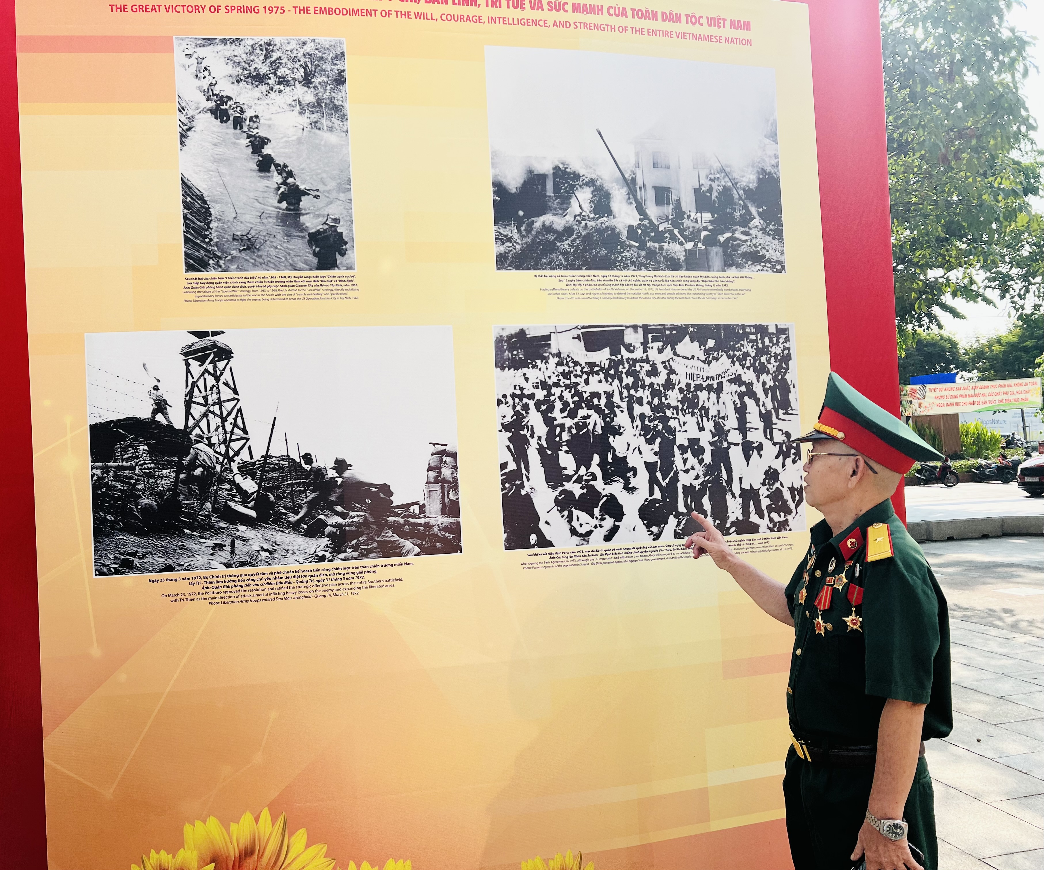 vang mãi khúc khải hoàn” giới thiệu 100 ảnh màu và trắng đen giới thiệu về cuộc đấu tranh hào hùng của quân và dân miền Nam trong cuộc kháng chiến chống Mỹ, cứu nước; kết quả của cả chặng đường dài chiến đấu đầy hy sinh gian khổ và thắng lợi vẻ vang của người dân Việt Nam yêu nước, của khối đại đoàn kết toàn dân tộc dưới ngọn cờ vẻ vang của Đảng Cộng sản Việt Nam; niềm tin son sắt vào Chủ tịch Hồ Chí Minh kính yêu cùng với sự ủng hộ quốc tế to lớn; những hình ảnh về Thành phố Hồ Chí Minh tiếp tục phát huy truyền thống năng động, sáng tạo, từng bước tháo gỡ những khó khăn; tiên phong hiện thực hóa khát vọng vươn mình, hướng đến xây dựng Thành phố trở thành một đô thị văn minh, hiện đại, trung tâm đổi mới sáng tạo, năng động, hội nhập, đi đầu trong sự nghiệp công nghiệp hóa, hiện đại hóa đất nước, có vị trí nổi trội ở khu vực Đông Nam Á; xứng đáng với vinh dự lớn, được mang tên Chủ tịch Hồ Chí Minh.