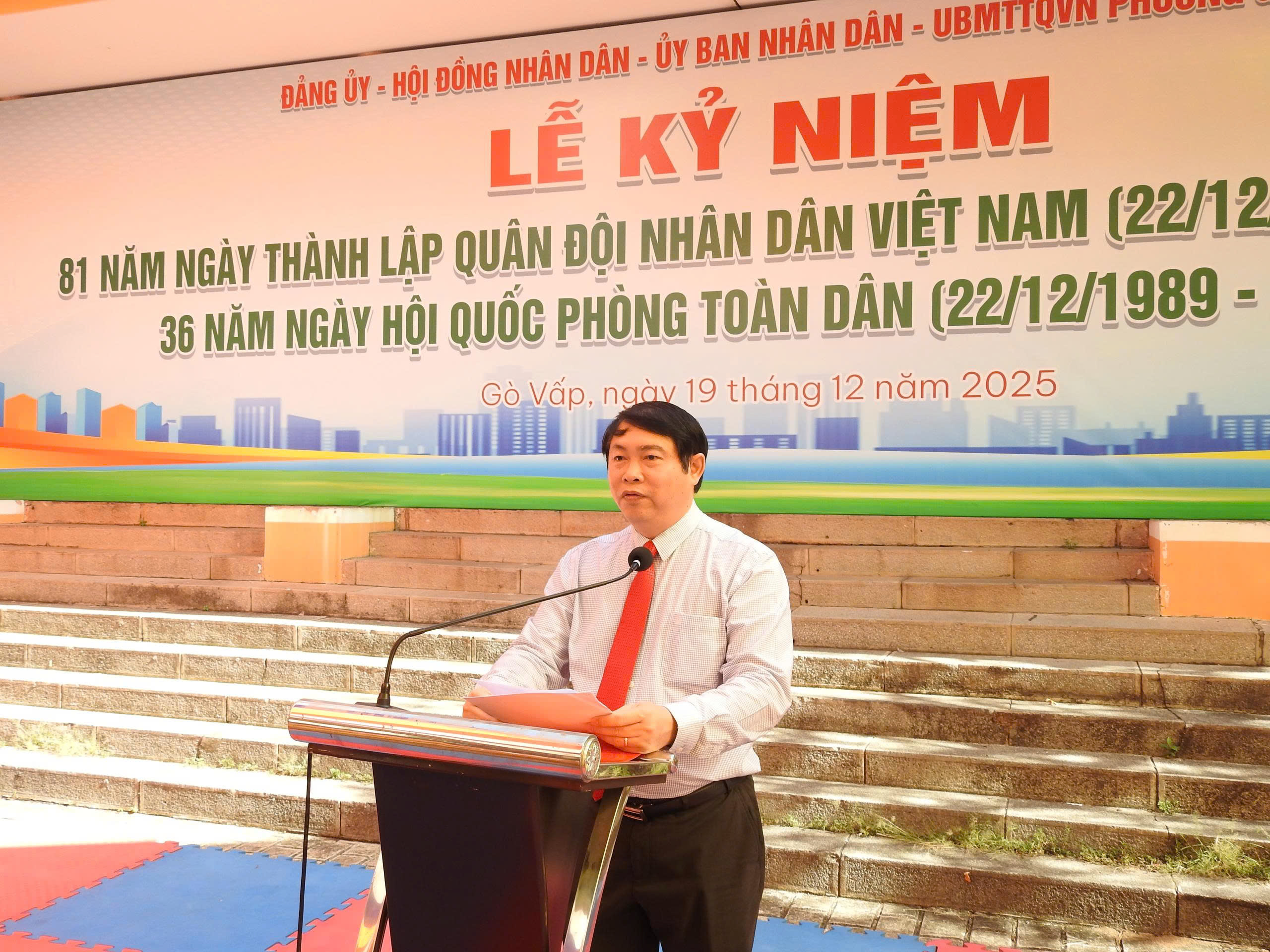 Phát biểu tại lễ kỷ niệm, thay mặt Đảng bộ, chính quyền, Nhân dân và lực lượng vũ trang phường Gò Vấp, đồng chí Nguyễn Trí Dũng, Bí thư Đảng ủy phường trân trọng gửi đến các bậc lão thành cách mạng, Anh hùng lực lượng vũ trang Nhân dân, các đồng chí tướng lĩnh, sĩ quan cao cấp QĐND Việt Nam đã nghỉ hưu, thân nhân các gia đình liệt sĩ, các đồng chí thương binh, bệnh binh, gia đình có công với cách mạng, các đồng chí cán bộ nghỉ hưu, cán bộ, chiến sĩ, công nhân viên chức quốc phòng của lực lượng vũ trang lời chúc mạnh khỏe và những điều tốt đẹp nhất; đồng thời cám ơn đồng bào đã góp phần chăm lo xây dựng Quân đội, xây dựng lực lượng vũ trang nói chung và phường Gò Vấp nói riêng không ngừng lớn mạnh, trưởng thành, đặc biệt là các đồng chí tướng lĩnh, Anh hùng lực lượng vũ trang Nhân dân, sĩ quan cao cấp nghỉ hưu đã góp nhiều ý kiến, kinh nghiệm quý báu để xây dựng phường Gò Vấp vững mạnh về mọi mặt trong thời gian qua.