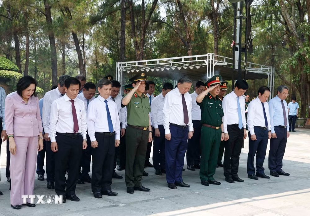 Tổng Bí thư, Chủ tịch nước Tô Lâm và đoàn công tác Trung ương tưởng niệm tại Nghĩa trang liệt sỹ Quốc gia Trường Sơn. (Ảnh: Thống Nhất/TTXVN)