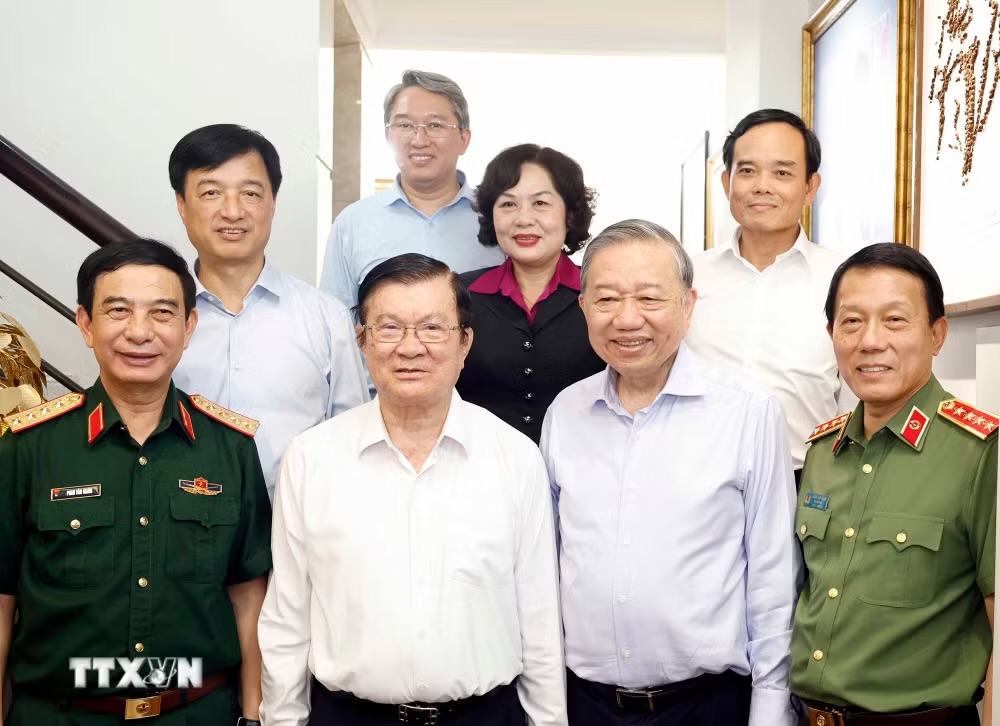 Tổng Bí thư, Chủ tịch nước Tô Lâm cùng Đoàn công tác Trung ương đến thăm nguyên Chủ tịch nước Trương Tấn Sang. (Ảnh: Thống Nhất/TTXVN)