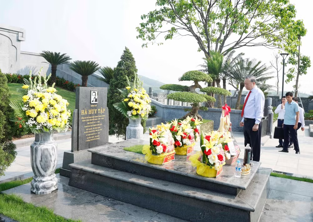 Trước khu mộ, nơi an nghỉ của Tổng Bí thư Hà Huy Tập, nhà lãnh đạo tài năng, nhà lý luận xuất sắc của Đảng, người chiến sĩ Cộng sản kiên trung, người con ưu tú của quê hương Hà Tĩnh và của dân tộc Việt Nam, Tổng Bí thư, Chủ tịch nước Tô Lâm cùng Đoàn đại biểu Lãnh đạo Đảng, Nhà nước và tỉnh Hà Tĩnh đã dâng nén hương thơm và những bông hoa tươi thắm, bày tỏ niềm thành kính, lòng biết ơn vô hạn trước những công lao, cống hiến to lớn của đồng chí cho sự nghiệp cách mạng vì độc lập, tự do của Tổ quốc, vì hạnh phúc của nhân dân.